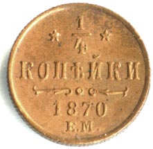 Лицевая сторона — вензель Александра II в венке из лавровой и дубовой ветвей; оборотная — обозначение номинала (1/4 копейки) и дата. Нормативный вес — 0,82 грамма, гурт рубчатый.