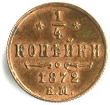 Лицевая сторона — вензель Александра II в венке из лавровой и дубовой ветвей; оборотная — обозначение номинала (1/4 копейки) и дата. Нормативный вес — 0,82 грамма, гурт рубчатый.