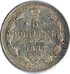 Лицевая сторона — гербовый орел, оборотная —обозначение номинала (5 копеекъ), окруженное венком из лавровой и дубовой ветвей и дата.