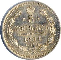 Лицевая сторона — гербовый орел, оборотная —обозначение номинала (5 копеекъ), окруженное венком из лавровой и дубовой ветвей и дата.