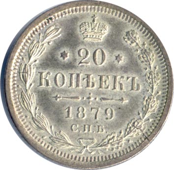 Лицевая сторона — гербовый орел, оборотная —обозначение номинала (20 копеекъ), окруженное венком из лавровой и дубовой ветвей и дата.