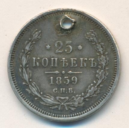 Орел на всех двадцатипятикопеечнеиках этого типа выполнен с одной формы, но в 1859-1860 годах Св. Георгий может быть формы А (в плаще) или В (без плаща), а с 1861 года — только без плаща.
