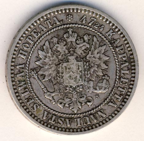 Лицевая сторона — российский двуглавый орел с гербом Великого княжества Финляндского на груди в кольцевой надписи с указанием количества штук (47,24) из фунта сплава серебра , оборотная — номинал и дата в венке из дубовых листьев. Проба — 868, нормативный вес — 10,37 грамма.