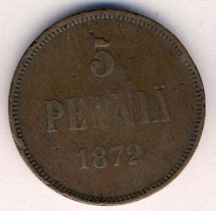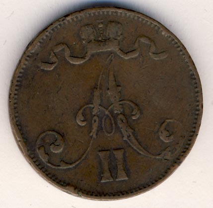 Лицевая сторона — вензель Александра II, оборотная — номинал (5 PENNIA) и дата. Нормативный вес — 6,40 грамма, гурт гладкий.