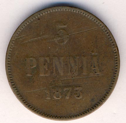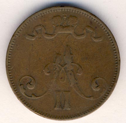 Лицевая сторона — вензель Александра II, оборотная — номинал (5 PENNIA) и дата. Нормативный вес — 6,40 грамма, гурт гладкий.