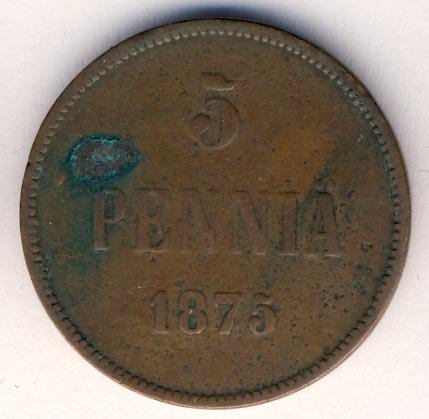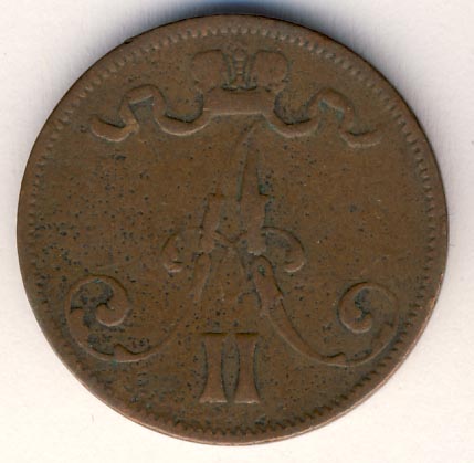 Лицевая сторона — вензель Александра II, оборотная — номинал (5 PENNIA) и дата. Нормативный вес — 6,40 грамма, гурт гладкий.