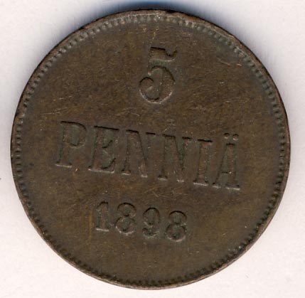 Лицевая сторона — вензель Александра II, оборотная — номинал (5 PENNIA) и дата. Нормативный вес — 6,40 грамма, гурт гладкий.