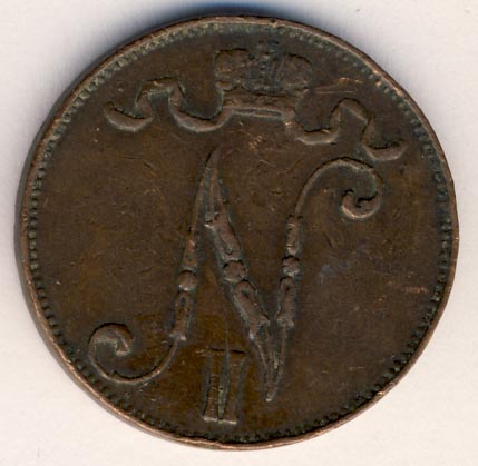 Лицевая сторона — вензель Александра II, оборотная — номинал (5 PENNIA) и дата. Нормативный вес — 6,40 грамма, гурт гладкий.