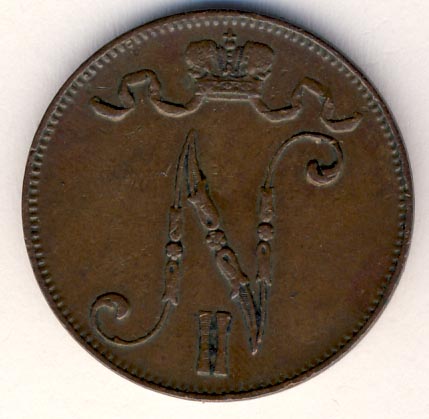 Лицевая сторона — вензель Александра II, оборотная — номинал (5 PENNIA) и дата. Нормативный вес — 6,40 грамма, гурт гладкий.