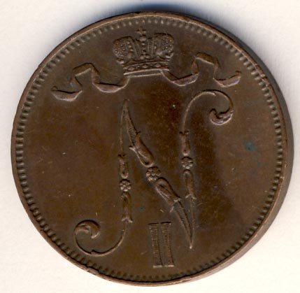 Лицевая сторона — вензель Александра II, оборотная — номинал (5 PENNIA) и дата. Нормативный вес — 6,40 грамма, гурт гладкий.