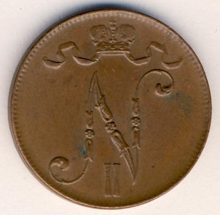 Лицевая сторона — вензель Александра II, оборотная — номинал (5 PENNIA) и дата. Нормативный вес — 6,40 грамма, гурт гладкий.