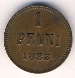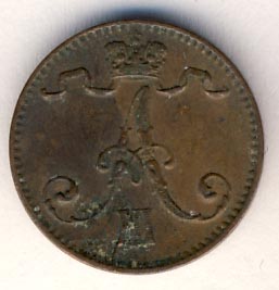 Лицевая сторона — вензель Александра II, оборотная — номинал (1 PENNIA) и дата. Нормативный вес — 1,28 грамма, гурт гладкий.