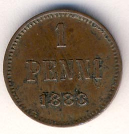 Лицевая сторона — вензель Александра II, оборотная — номинал (1 PENNIA) и дата. Нормативный вес — 1,28 грамма, гурт гладкий.