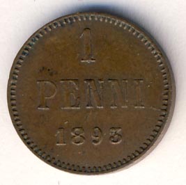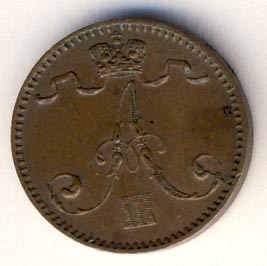 Лицевая сторона — вензель Александра II, оборотная — номинал (1 PENNIA) и дата. Нормативный вес — 1,28 грамма, гурт гладкий.