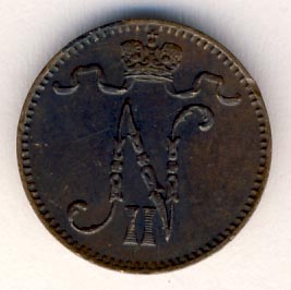 Лицевая сторона — вензель Александра II, оборотная — номинал (1 PENNIA) и дата. Нормативный вес — 1,28 грамма, гурт гладкий.