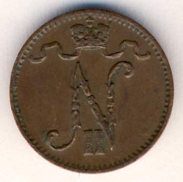 Лицевая сторона — вензель Александра II, оборотная — номинал (1 PENNIA) и дата. Нормативный вес — 1,28 грамма, гурт гладкий.