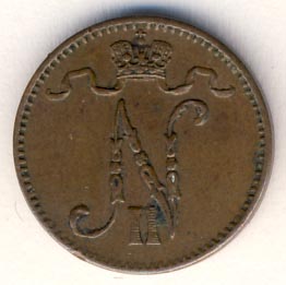 Лицевая сторона — вензель Александра II, оборотная — номинал (1 PENNIA) и дата. Нормативный вес — 1,28 грамма, гурт гладкий.