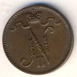Лицевая сторона — вензель Александра II, оборотная — номинал (1 PENNIA) и дата. Нормативный вес — 1,28 грамма, гурт гладкий.