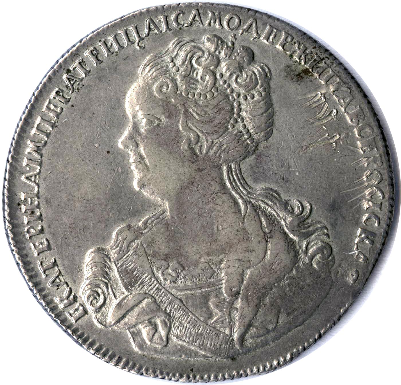Гурт на монетах Кадашевского двора - «россискоi рубль ея i в (императорского величества) московского двора», гурт на петербургских монетах — узор или шнур. Легенда лицевой стороны - «Екатерина императрица и самодержица всероссийская», оборотной - «Монета новая цена рубль» и дата арабскими цифрами. Проба -729, нормативный вес — 28,44 грамма.