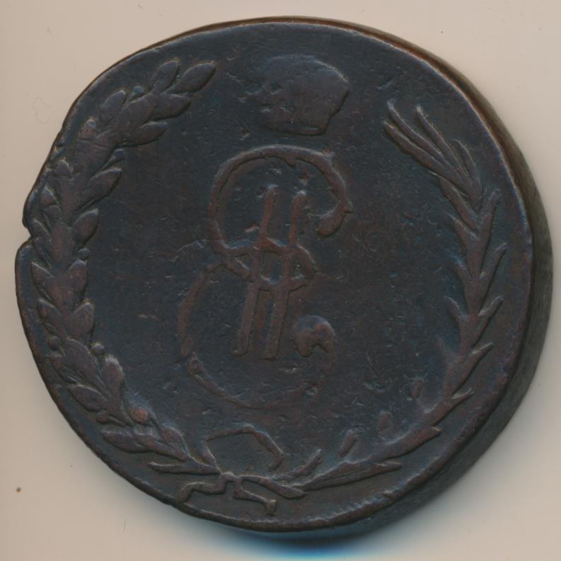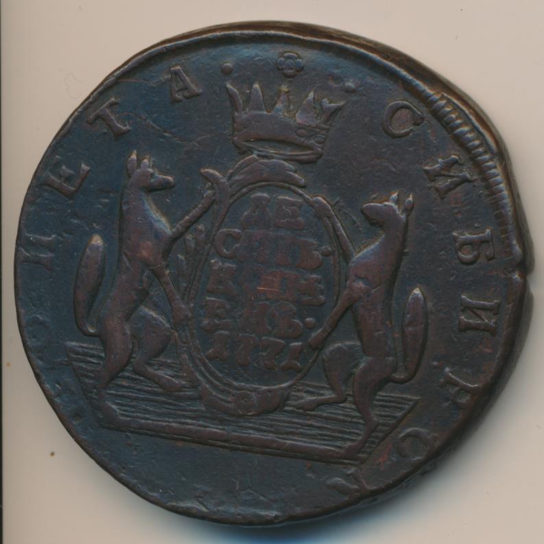 Лицевая сторона - два соболя поддерживают щит с обозначением номинала (десять копеекъ) под короной, надпись «СИБИРСКАЯ МОНЕТА». Оборотная — вензель Екатерины II в венке из пальмовой и лавровой ветвей. Вес — 65, 52 грамма. Нормативный вес — 65,52 грамма, это самая увесистая медная монета регулярного чекана в истории российской нумизматики. Гурт — надпись «колыванская медь» или шнур.
