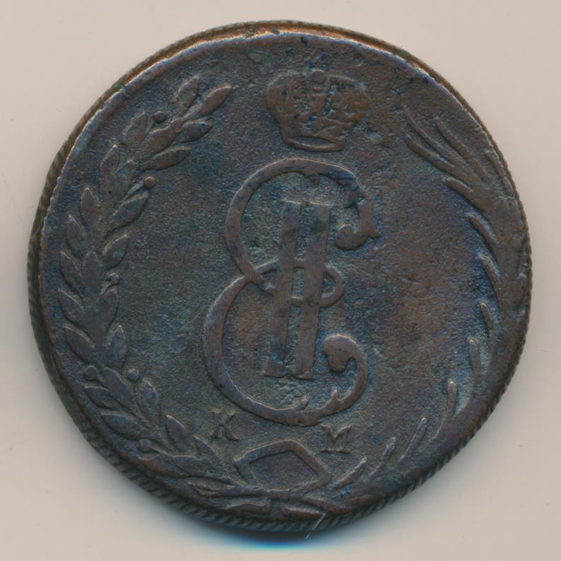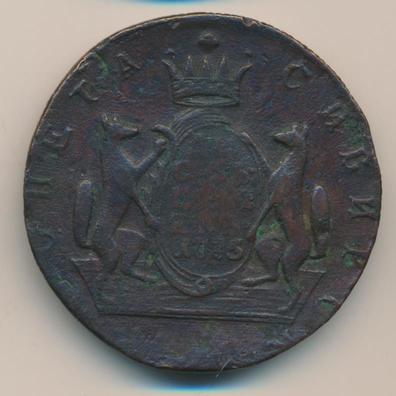 Лицевая сторона - два соболя поддерживают щит с обозначением номинала (десять копеекъ) под короной, надпись «СИБИРСКАЯ МОНЕТА». Оборотная — вензель Екатерины II в венке из пальмовой и лавровой ветвей. Вес — 65, 52 грамма. Нормативный вес — 65,52 грамма, это самая увесистая медная монета регулярного чекана в истории российской нумизматики. Гурт — надпись «колыванская медь» или шнур.
