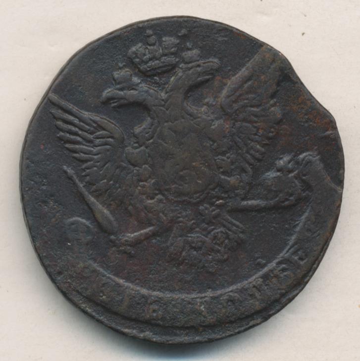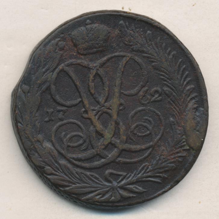 Лицевая сторона — двуглавый орел и обозначение номинала (пять копеекъ), оборотная — сложный симметричный вензель Елизаветы Петровны и дата. Нормативный вес — 51,19 грамма, гурт — сетка.