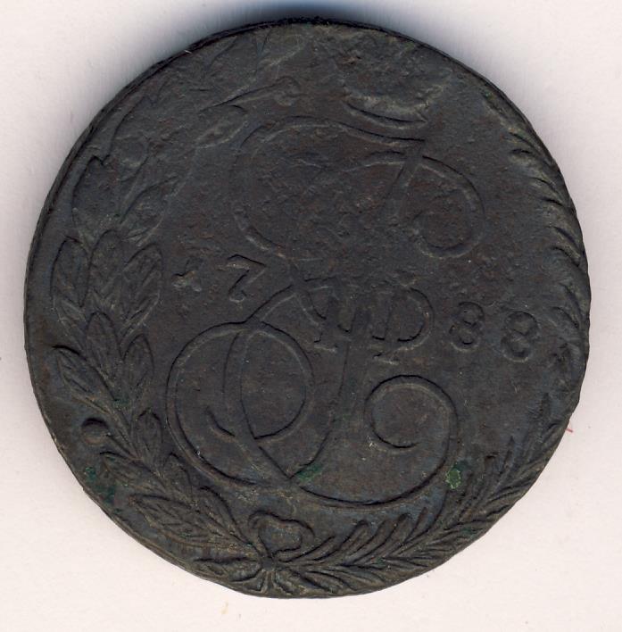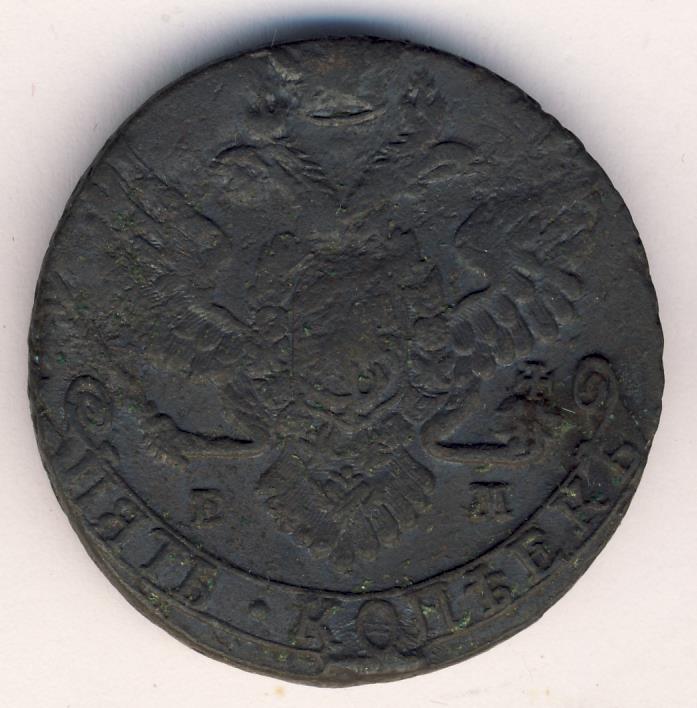 Лицевая сторона — двуглавый орел (выделяют 17 типов орла) и обозначение номинала (пять копеекъ), оборотная — вензель Екатерины II и дата. Нормативный вес — 51,19 грамма, гурт — сетка или шнур.
