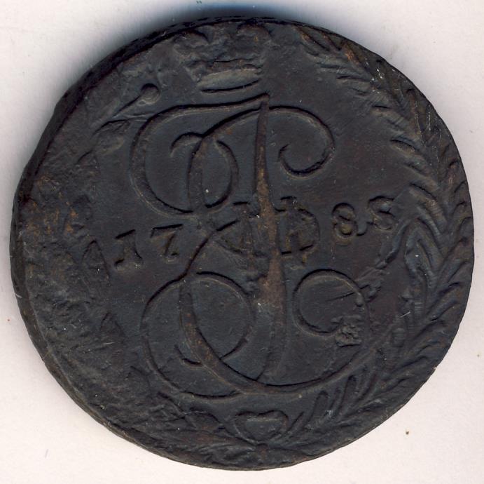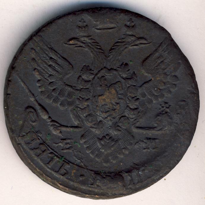 Лицевая сторона — двуглавый орел (выделяют 17 типов орла) и обозначение номинала (пять копеекъ), оборотная — вензель Екатерины II и дата. Нормативный вес — 51,19 грамма, гурт — сетка или шнур.
