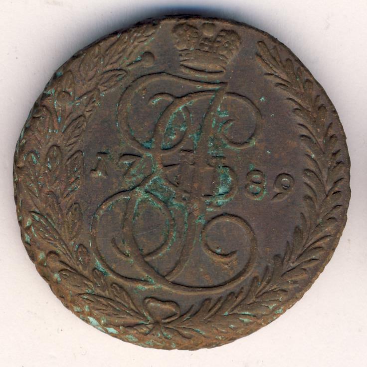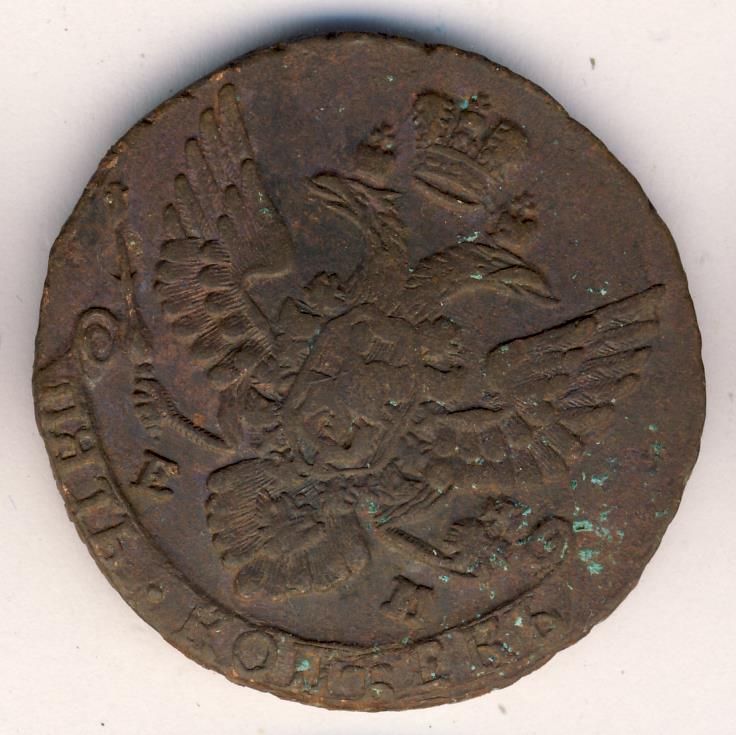 Лицевая сторона — двуглавый орел (выделяют 17 типов орла) и обозначение номинала (пять копеекъ), оборотная — вензель Екатерины II и дата. Нормативный вес — 51,19 грамма, гурт — сетка или шнур.