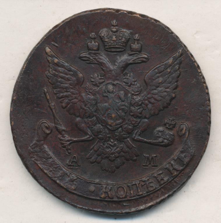 Лицевая сторона — двуглавый орел (выделяют 17 типов орла) и обозначение номинала (пять копеекъ), оборотная — вензель Екатерины II и дата. Нормативный вес — 51,19 грамма, гурт — сетка или шнур.