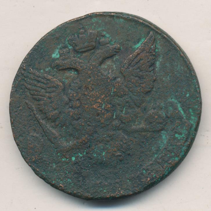 Лицевая сторона — двуглавый орел и обозначение номинала (пять копеекъ), оборотная — сложный симметричный вензель Елизаветы Петровны и дата. Нормативный вес — 51,19 грамма, гурт — сетка.