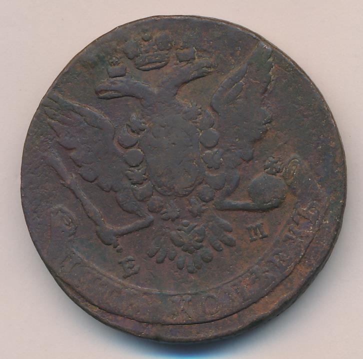 Лицевая сторона — двуглавый орел (выделяют 17 типов орла) и обозначение номинала (пять копеекъ), оборотная — вензель Екатерины II и дата. Нормативный вес — 51,19 грамма, гурт — сетка или шнур.