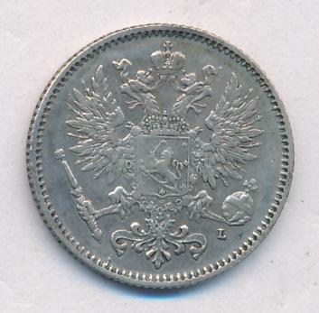 Лицевая сторона — российский двуглавый орел с гербом Великого княжества Финляндского на груди, оборотная — номинал и дата в венке из дубовых листьев. Проба — 750, нормативный вес — 2,55 грамма, гурт рубчатый.
