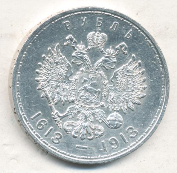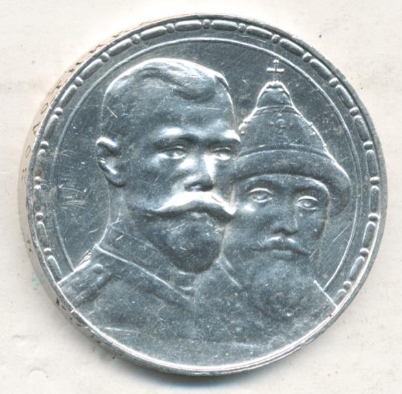 К 300-летию царствования Дома Романовых выпустили и юбилейный рубль, отчеканенный грандиозным тиражом почти в полтора миллиона экземпляров. На лицевой стороне монеты разместили портрет императора Николая II в военной форме, за спиной которого виден основатель династии, царь Михаил Романов в царском одеянии и в шапке Мономаха.