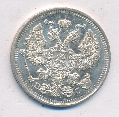 Лицевая сторона — гербовый орел, оборотная —обозначение номинала (20 копеекъ), окруженное венком из лавровой и дубовой ветвей и дата.