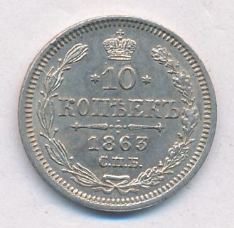 Лицевая сторона — гербовый орел, оборотная —обозначение номинала (10 копеекъ), окруженное венком из лавровой и дубовой ветвей и дата.
