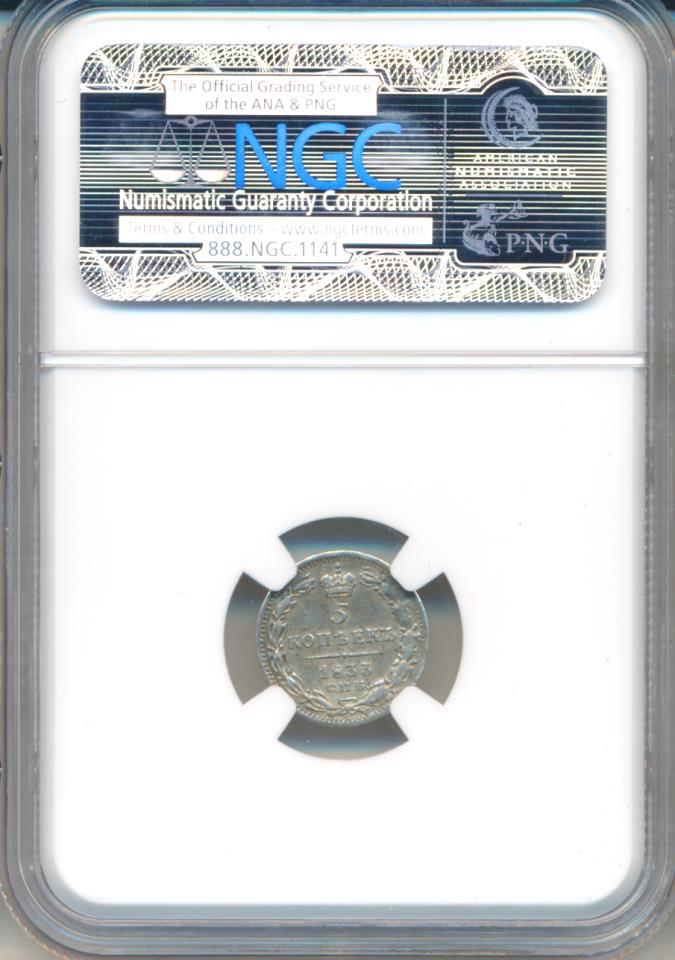 Лицевая сторона — новый гербовый орел с поднятыми крыльями, оборотная —обозначение номинала (5 копеекъ), окруженное венком из лавровой и дубовой ветвей и дата. Проба — 868, нормативный вес — 1,04 грамма.