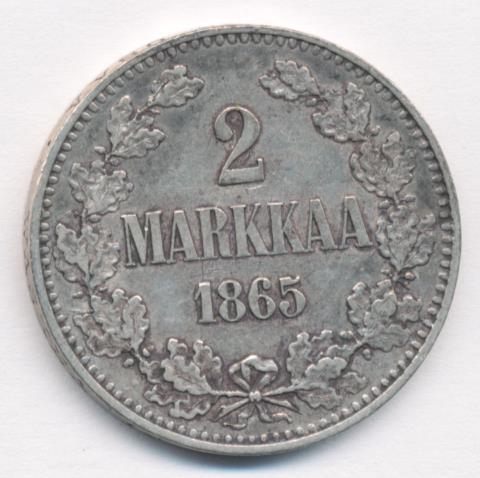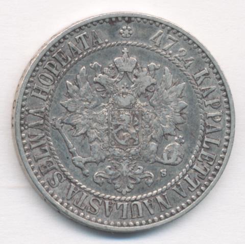Лицевая сторона — российский двуглавый орел с гербом Великого княжества Финляндского на груди в кольцевой надписи с указанием количества штук (47,24) из фунта сплава серебра , оборотная — номинал и дата в венке из дубовых листьев. Проба — 868, нормативный вес — 10,37 грамма.