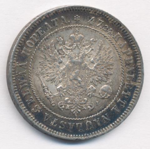 Лицевая сторона — российский двуглавый орел с гербом Великого княжества Финляндского на груди в кольцевой надписи с указанием количества штук (47,24) из фунта сплава серебра , оборотная — номинал и дата в венке из дубовых листьев. Проба — 868, нормативный вес — 10,37 грамма.