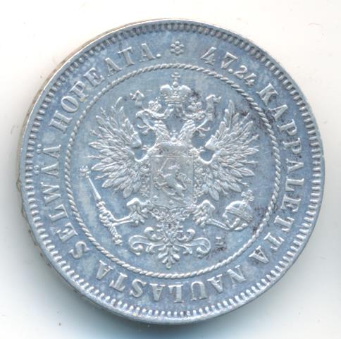 Лицевая сторона — российский двуглавый орел с гербом Великого княжества Финляндского на груди в кольцевой надписи с указанием количества штук (47,24) из фунта сплава серебра , оборотная — номинал и дата в венке из дубовых листьев. Проба — 868, нормативный вес — 10,37 грамма.