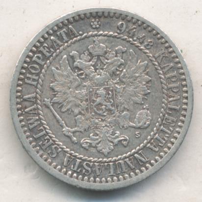 Лицевая сторона — российский двуглавый орел с гербом Великого княжества Финляндского на груди в кольцевой надписи с указанием количества штук (94,48) из фунта сплава серебра, оборотная — номинал и дата в венке из дубовых листьев. Проба — 868, нормативный вес — 5,18 грамма, гурт рубчатый.