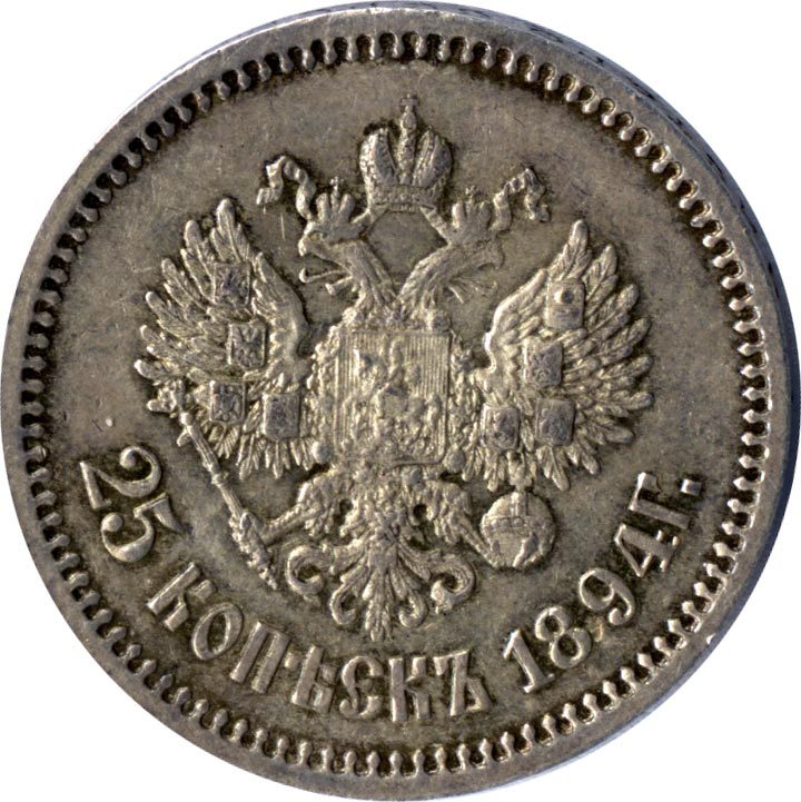 Лицевая сторона — портрет Александра III в круговой надписи «Б.М.АЛЕКСАНДРЪ III ИМПЕРАТОРЪ И САМОДЕРЖЕЦЪ ВСЕРОССIЙСКIЙ», оборотная — двуглавый орел, обозначение номинала (25 копеекъ) и дата.