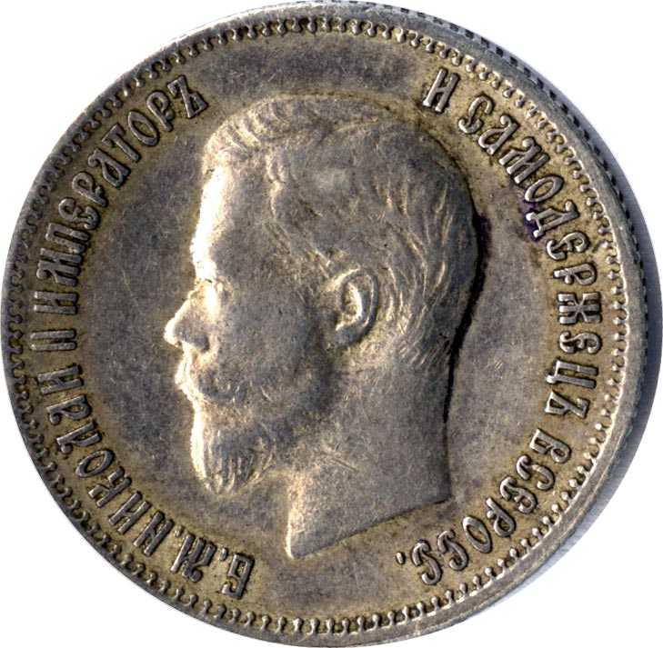 Николай II сохраняет принятый отцом тип, но на банковских монетах его портрет (работы Васютинского) повернут влево (на запад). На оборотной стороне сохраняется тот же герб, вплоть до знака АГ под задней ногой коня.
