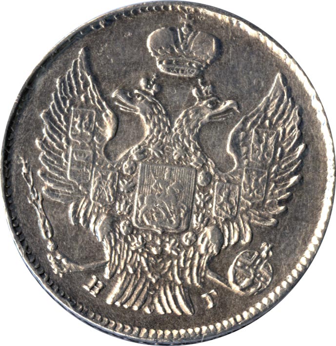 В январе 1830 года Николай I дает министру финансов Е. Ф. Канкрину устное указание «о сделании на золотых и серебряных монетах орла как на платиновых». На новом гербе крылья орла подняты, на них размещены шесть местных гербов — казанский, астраханский, сибирский, польский, херсонесский и финляндский. На груди орла — московский герб, на головах — короны. Выделяют шесть типов орла.