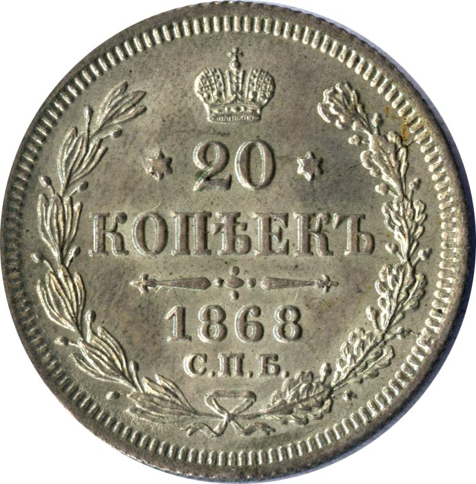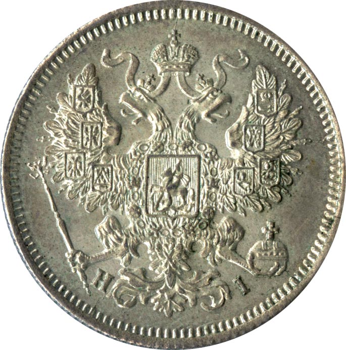 Лицевая сторона — гербовый орел, оборотная —обозначение номинала (20 копеекъ), окруженное венком из лавровой и дубовой ветвей и дата.