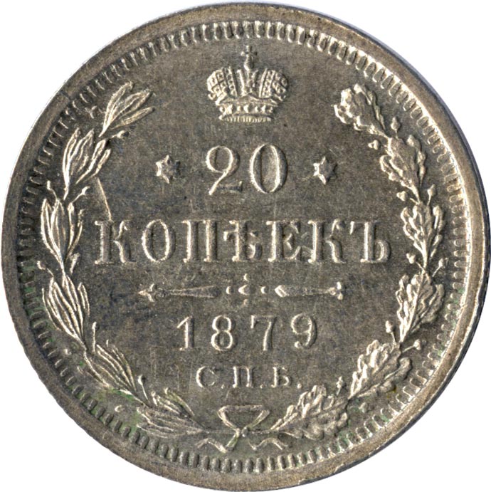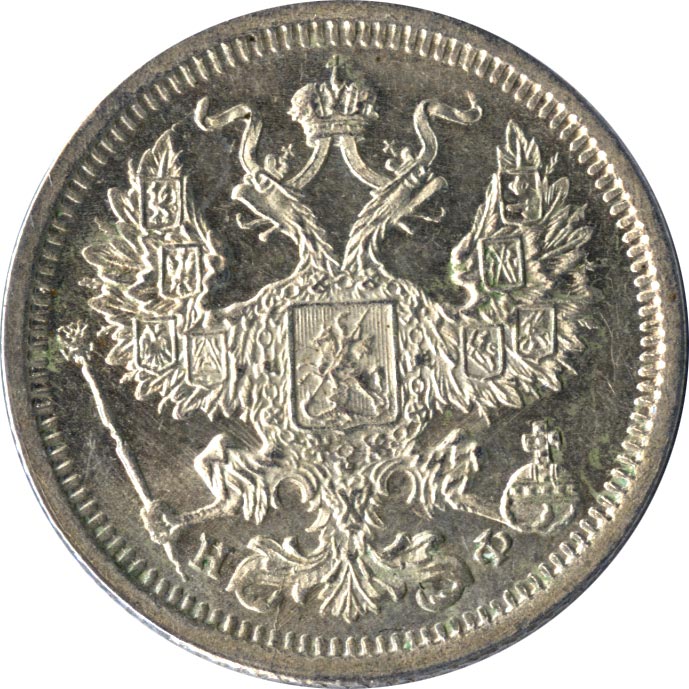 Лицевая сторона — гербовый орел, оборотная —обозначение номинала (20 копеекъ), окруженное венком из лавровой и дубовой ветвей и дата.