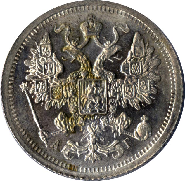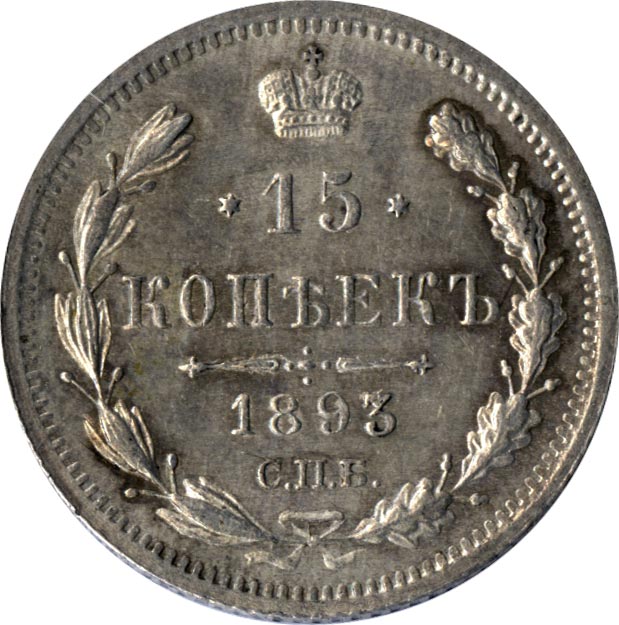 Лицевая сторона — гербовый орел, оборотная —обозначение номинала (15 копеекъ), окруженное венком из лавровой и дубовой ветвей и дата.