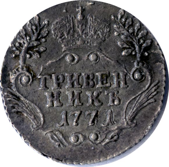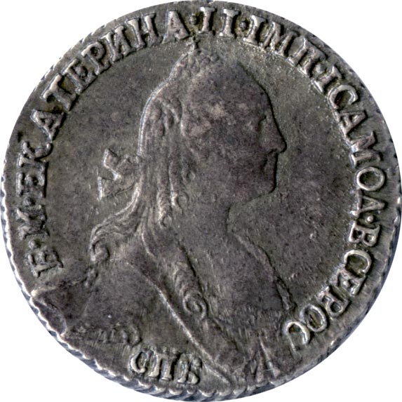 Лицевая сторона — портрет императрицы и надпись «Б М ЕКАТЕРИНА II IМП I САМОД ВСЕРОС», оборотная — обозначение номинала (гривенникъ) и дата. Проба — 750, нормативный вес — 2,37 грамма, гурт — шнур.