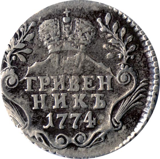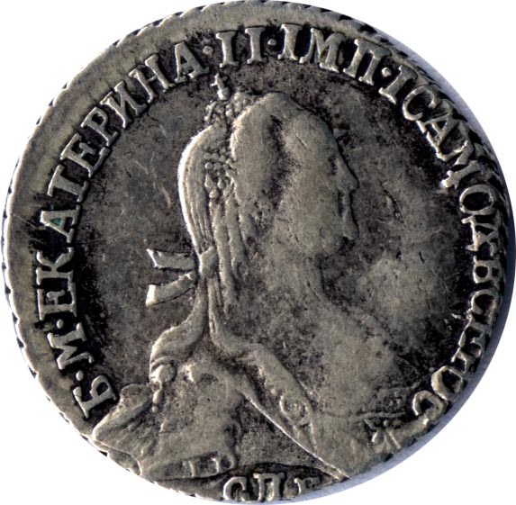 Лицевая сторона — портрет императрицы и надпись «Б М ЕКАТЕРИНА II IМП I САМОД ВСЕРОС», оборотная — обозначение номинала (гривенникъ) и дата. Проба — 750, нормативный вес — 2,37 грамма, гурт — шнур.