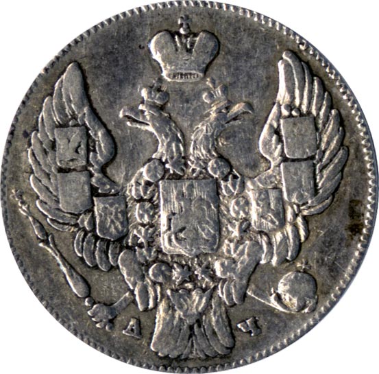 В январе 1830 года Николай I дает министру финансов Е. Ф. Канкрину устное указание «о сделании на золотых и серебряных монетах орла как на платиновых». На новом гербе крылья орла подняты, на них размещены шесть местных гербов — казанский, астраханский, сибирский, польский, херсонесский и финляндский. На груди орла — московский герб, на головах — короны. Выделяют шесть типов орла.
